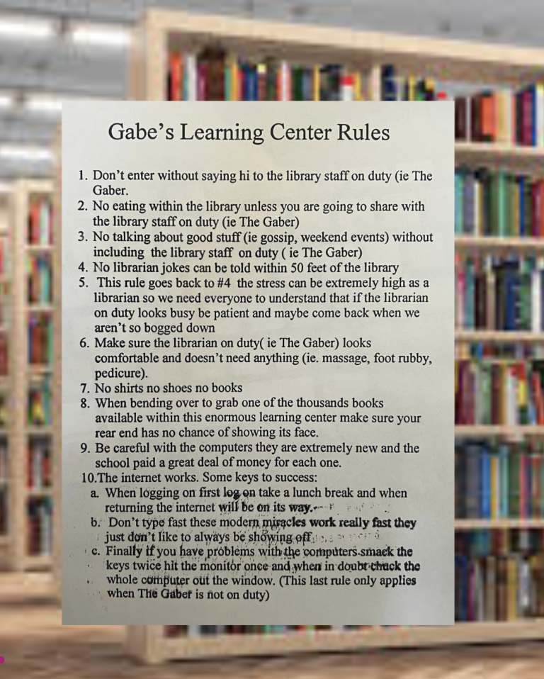 This was the best $15 an hour job I ever had. I would take hour-long breaks, obviously on the clock. I remember when I told people at school that I was the Chief Librarian, the most common response was very upsetting. “We have a library at the school?” This is when I decided I needed to take this job to the next level. We needed library rules.